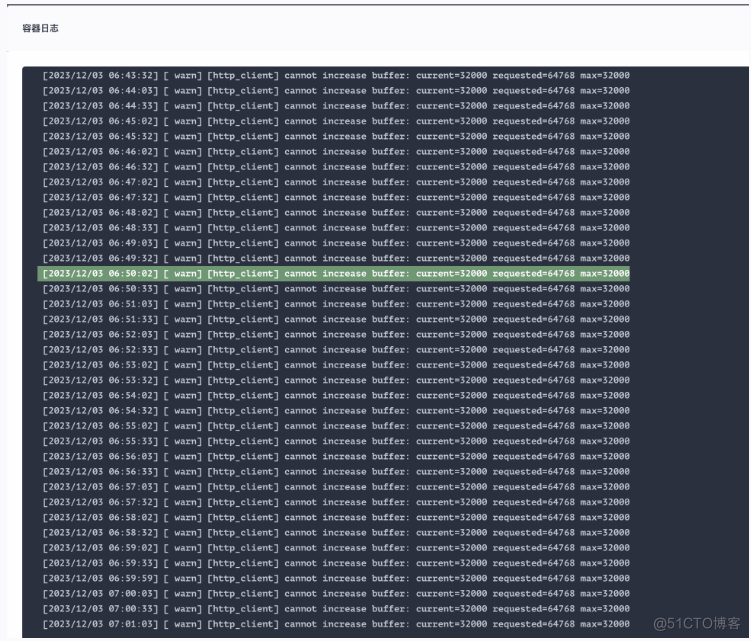 根据日志信息中 [ warn] [http_client] cannot increase buffer: current=32000 requested=64768 max=32000 可知,在 HTTP 客户端无法增加缓冲区大小。当前的缓冲区大小为 32000B(也就是默认大小为 32KB 字节),无法满足请求。由于项目是初期建设,日志平台参数都没有进行优化调整,都保持默认值,因此当日志量级达到一定的级别就会出现该问题,且无法动态调整。