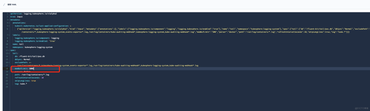 在"定制资源定义(CRD)"->input->"tail" 修改 memBufLimit 参数限制大小,可参考下图: