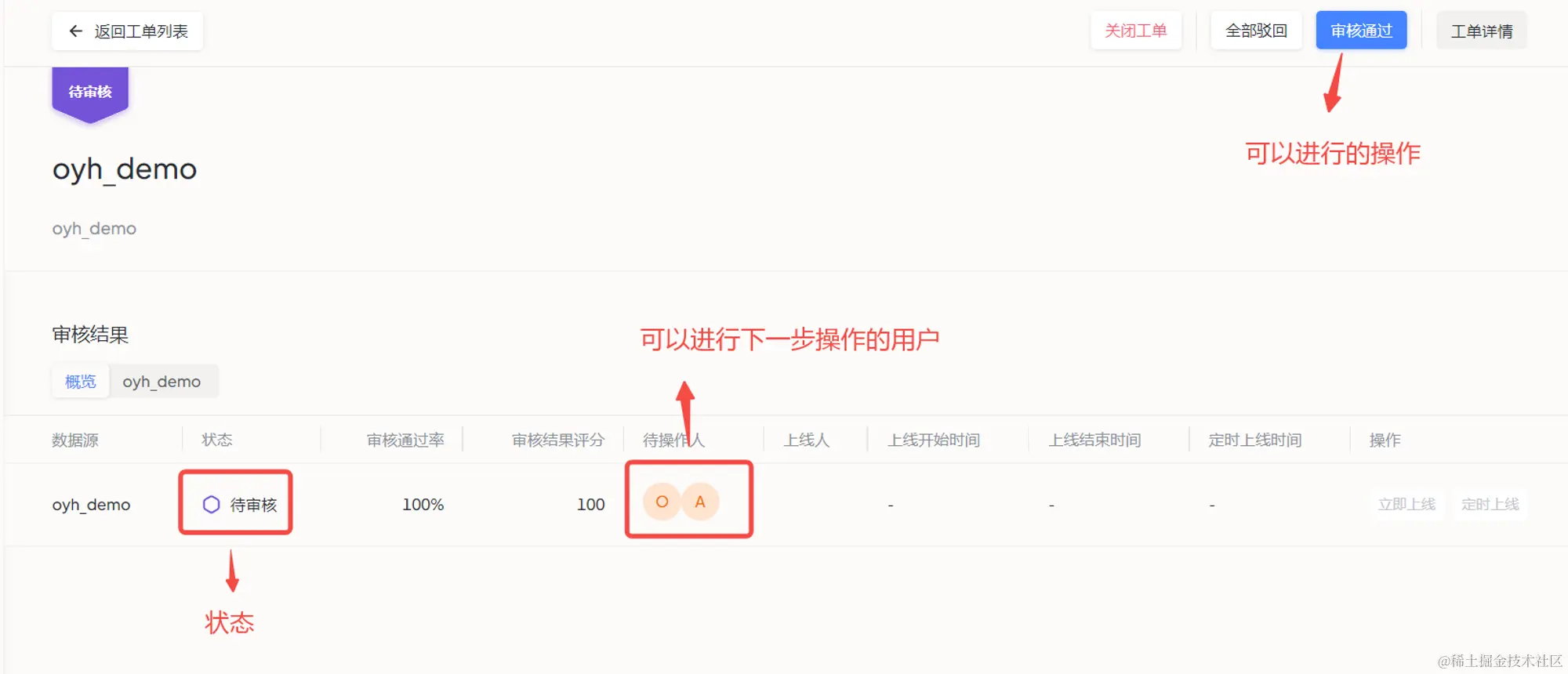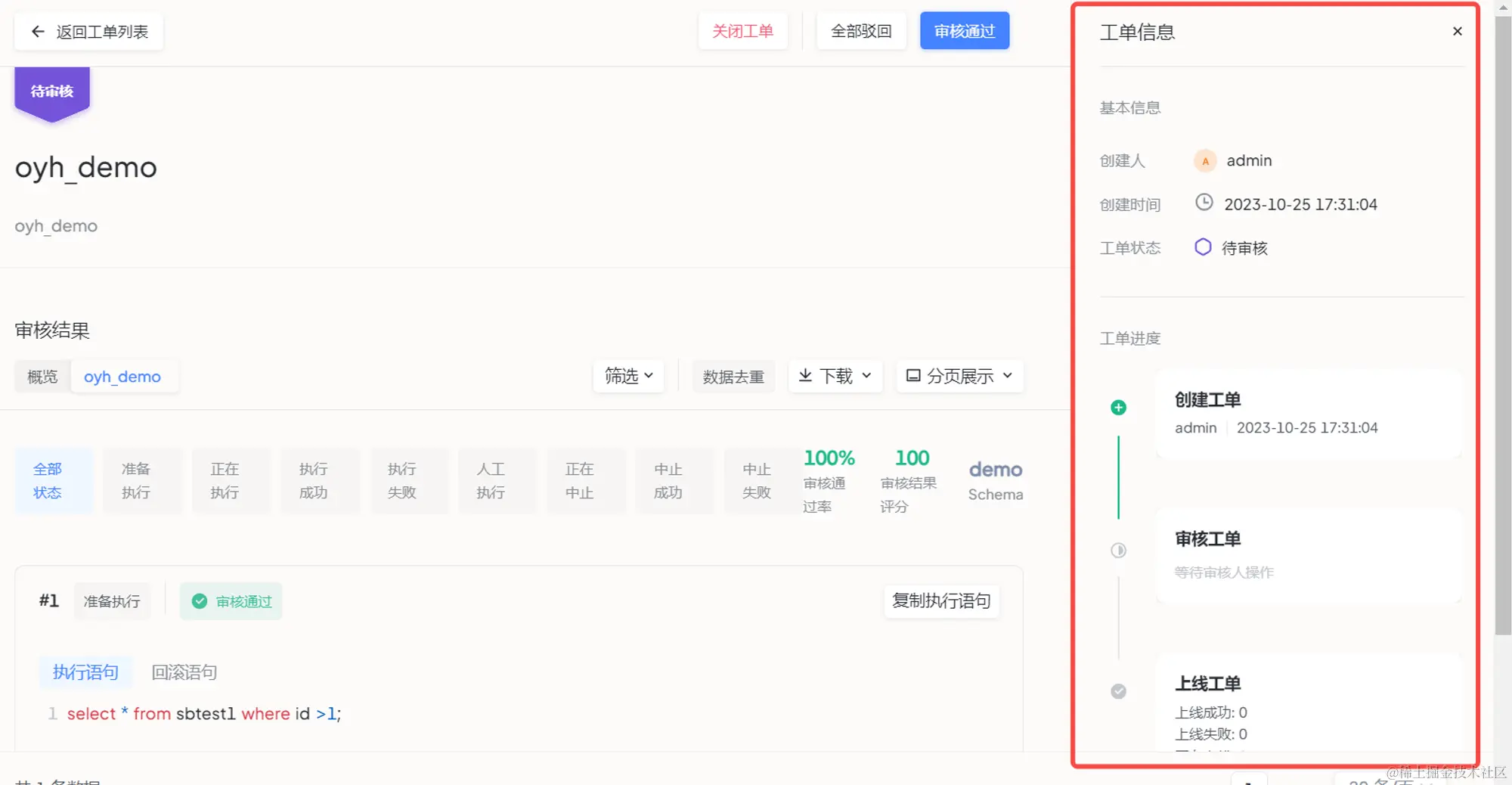 - 数据源标签:显示当前 SQL 操作的数据源,当有多个数据源时,可切换数据源标签,查看不同数据源上的审核情况;