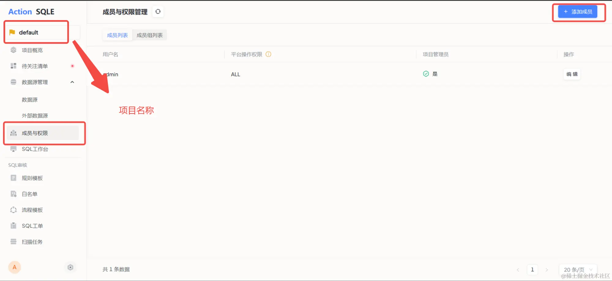 - 项目管理员将负责项目管理行为,若将当前成员设为项目管理员,则该成员将对项目内所有数据源拥有所有操作权限,无需额外配置权限。