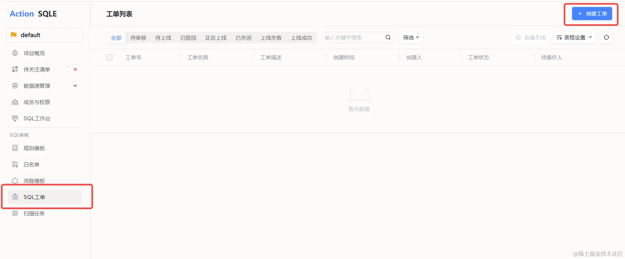 万事具备,只欠东风。用户和数据源都创建好后,咱们就可以利用工单来上线 SQL 了~