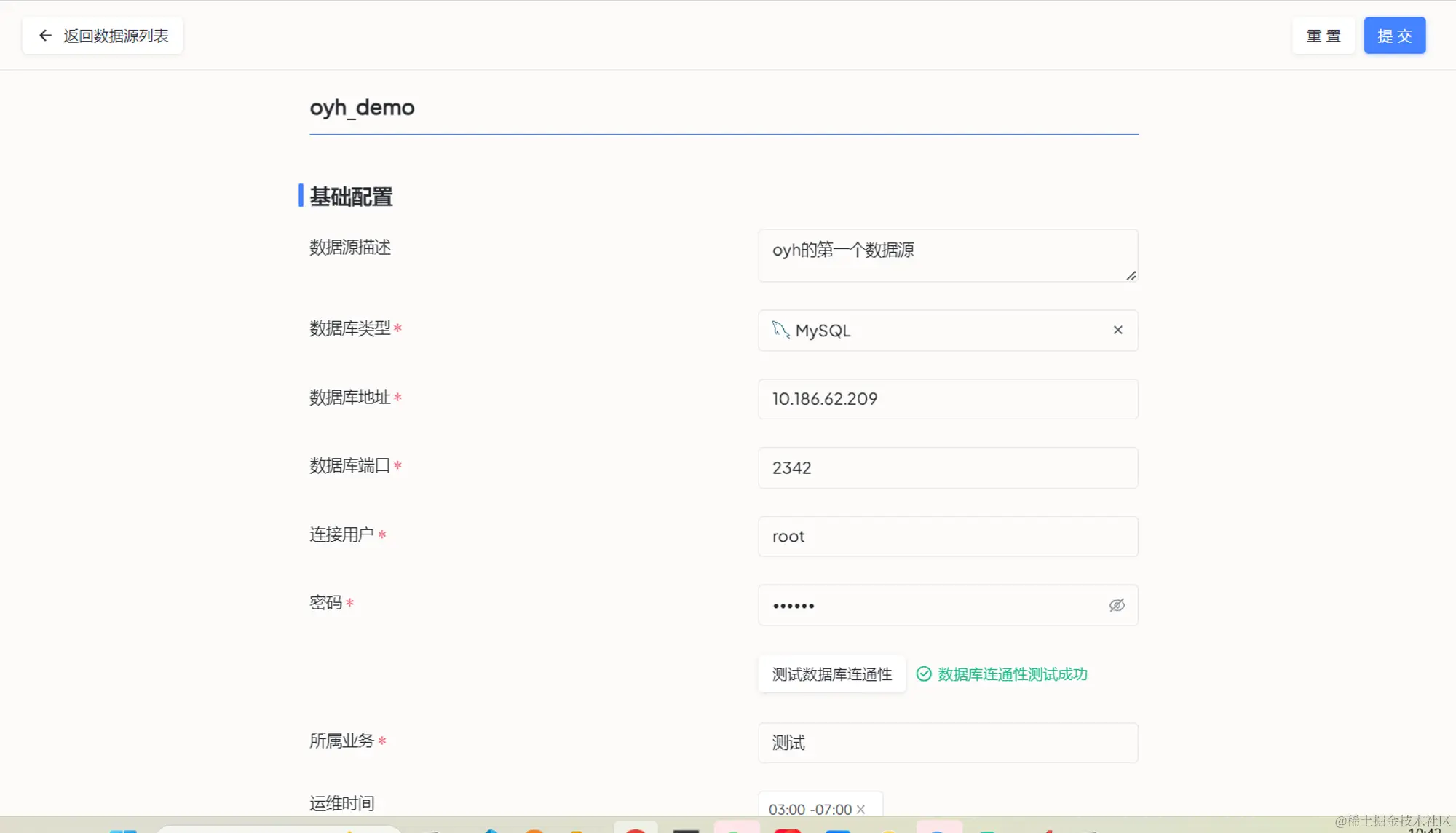 在填完数据库的基本信息后,点击 测试数据库连通性,当出现和笔者一致的 数据库连通性测试成功 后,代表这个数据源是可用的,否则就要检查一下自己是哪个信息填写错误了。