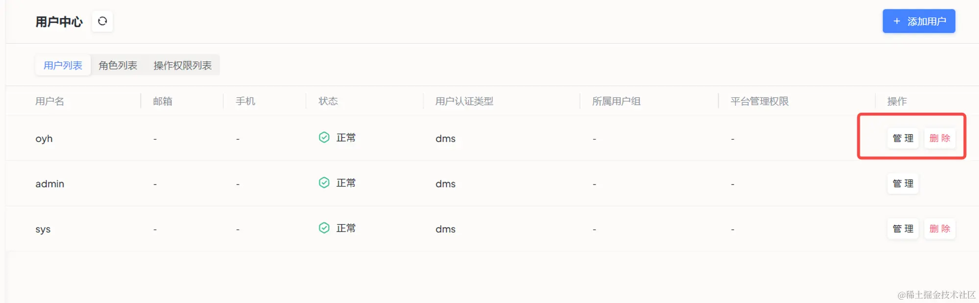 点击提交后,oyh 用户就创建成功了,可以点击管理对用户信息进行修改。至于前面提到的角色和用户组,有兴趣的小伙伴可以自己去试试,笔者这边就只使用默认的。