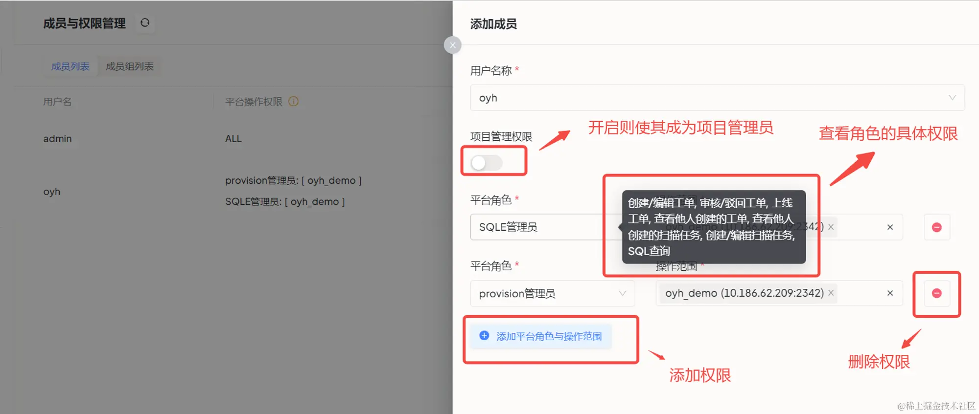 - 当移动到角色上方时,可以查看对应角色的具体权限。