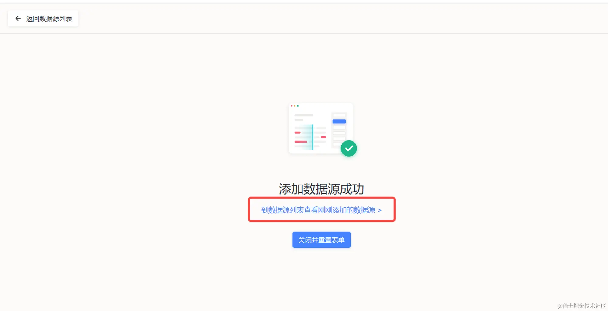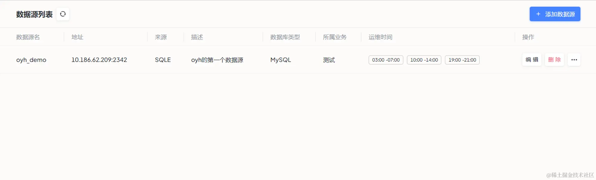 点击提交后,点击红框中的字体,可以快速跳转到查看自己刚刚创建数据源的信息,可以对数据源的信息进行编辑和删除的操作。