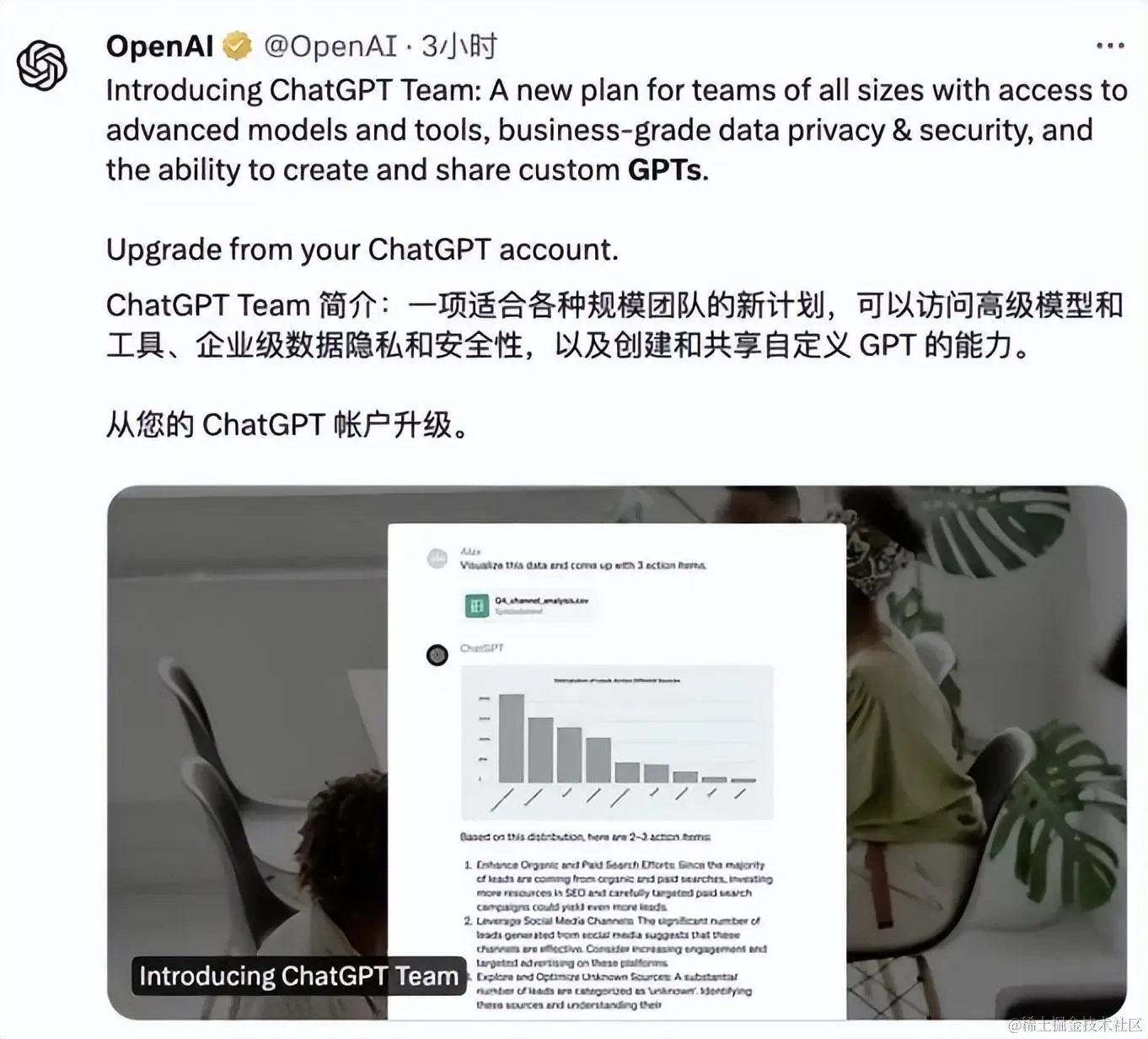 今天 OpenAI 还官宣了适合团队的 ChatGPT Team 计划,按年计费 25 美元/月,按月计费 30 美元/月。该计划支持创建和共享 GPTs、访问高级模型和工具、并具备企业级隐私安全。