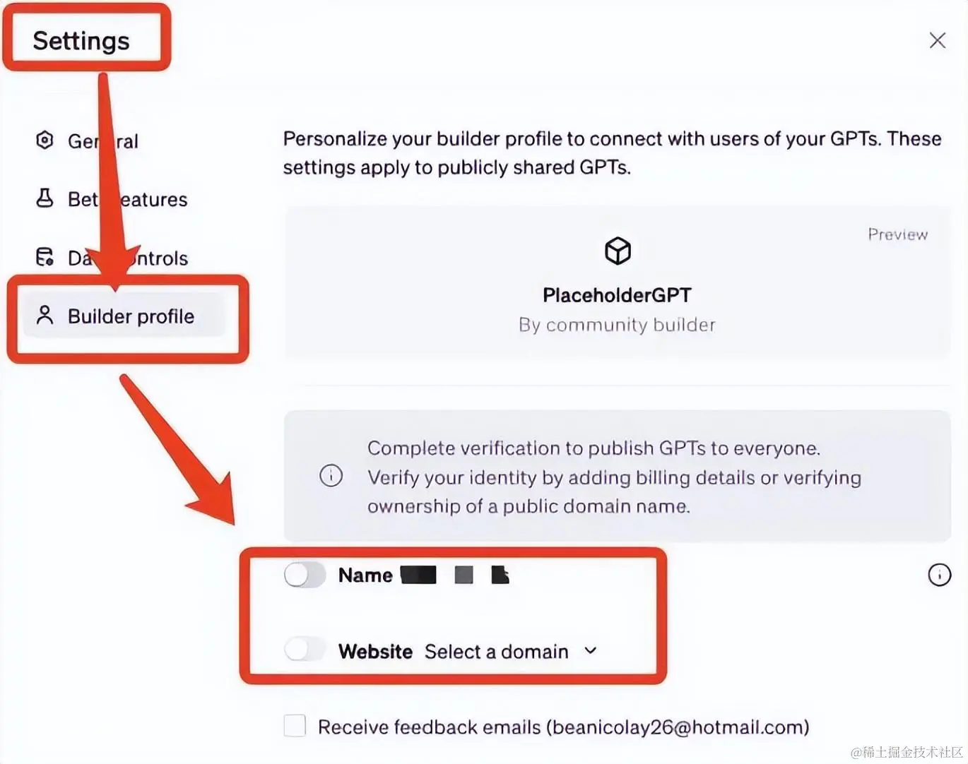 第二步: 验证构建者资料(启用你的姓名或已验证的网站,满足其中任意一个即可)。