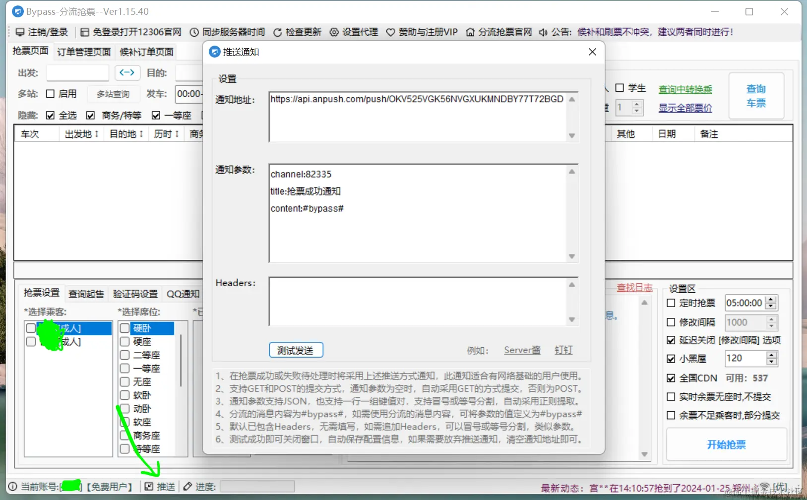 打开12306bypass,然后登录,登录之后点击左下角的推送,如图