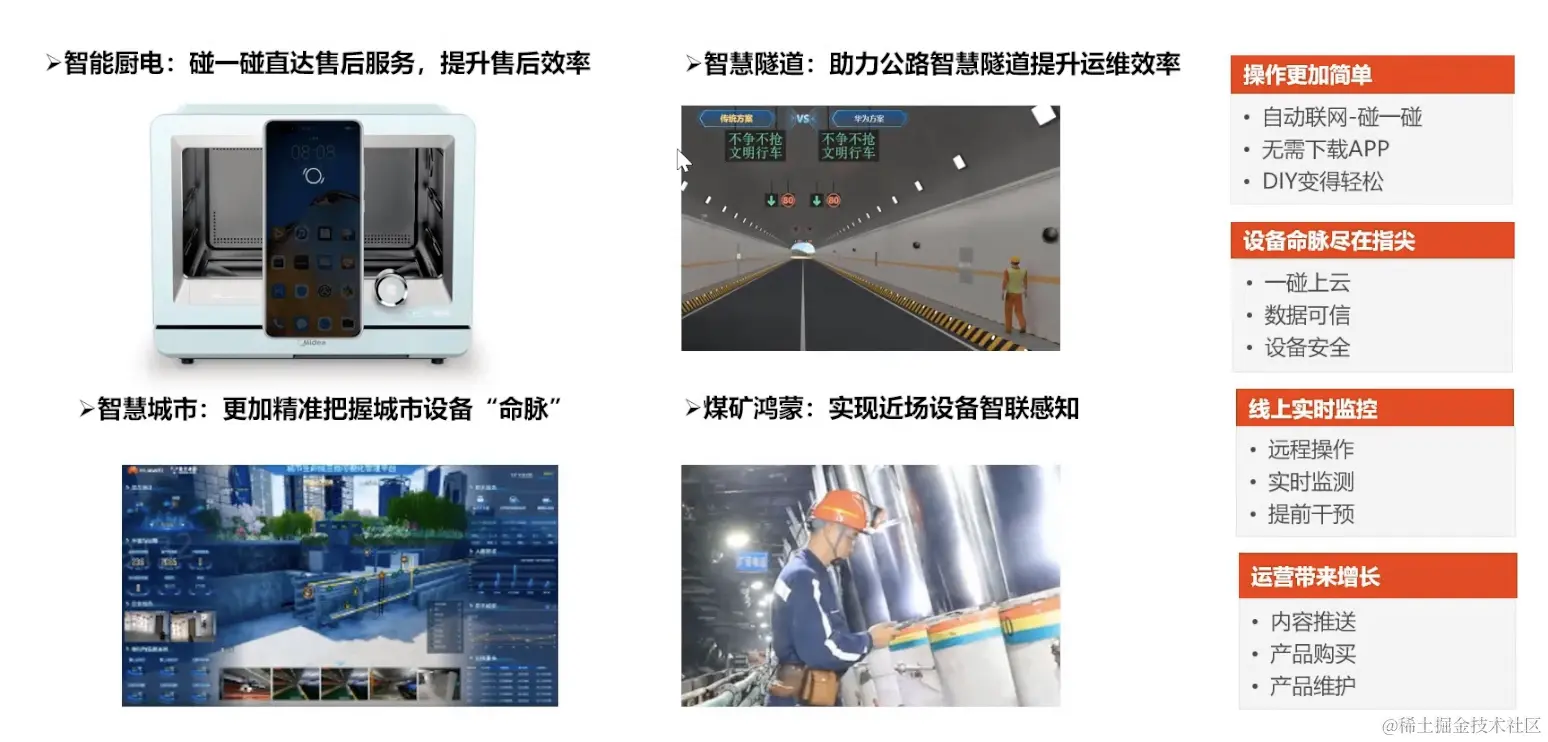 - 同时华为云IoT提供多样化的能力开放和loT设备接入服务的能力,为行业鸿蒙设备与物联网端到端开发服务。