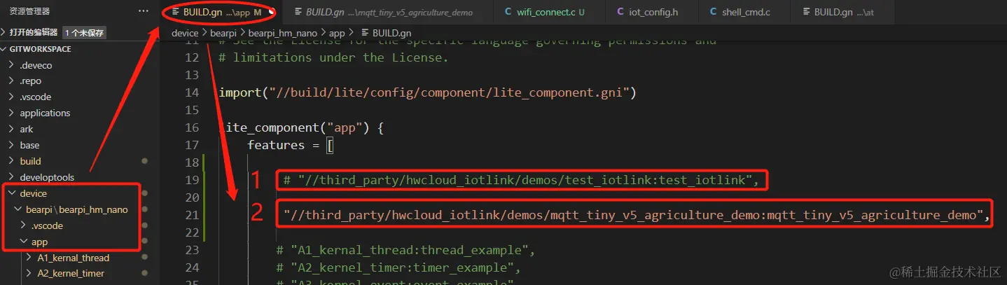 3、在OpenHarmony 3.0源码device\bearpi\bearpi_hm_nano\app\BUILD.gn中添加如下代码,根据#是否注释来决定具体编译demo的选择。