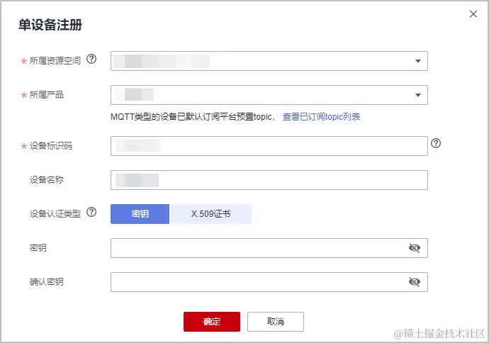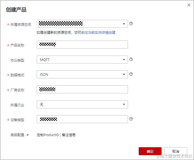 2、根据页面提示填写参数,然后单击“确认”,完成产品的创建。