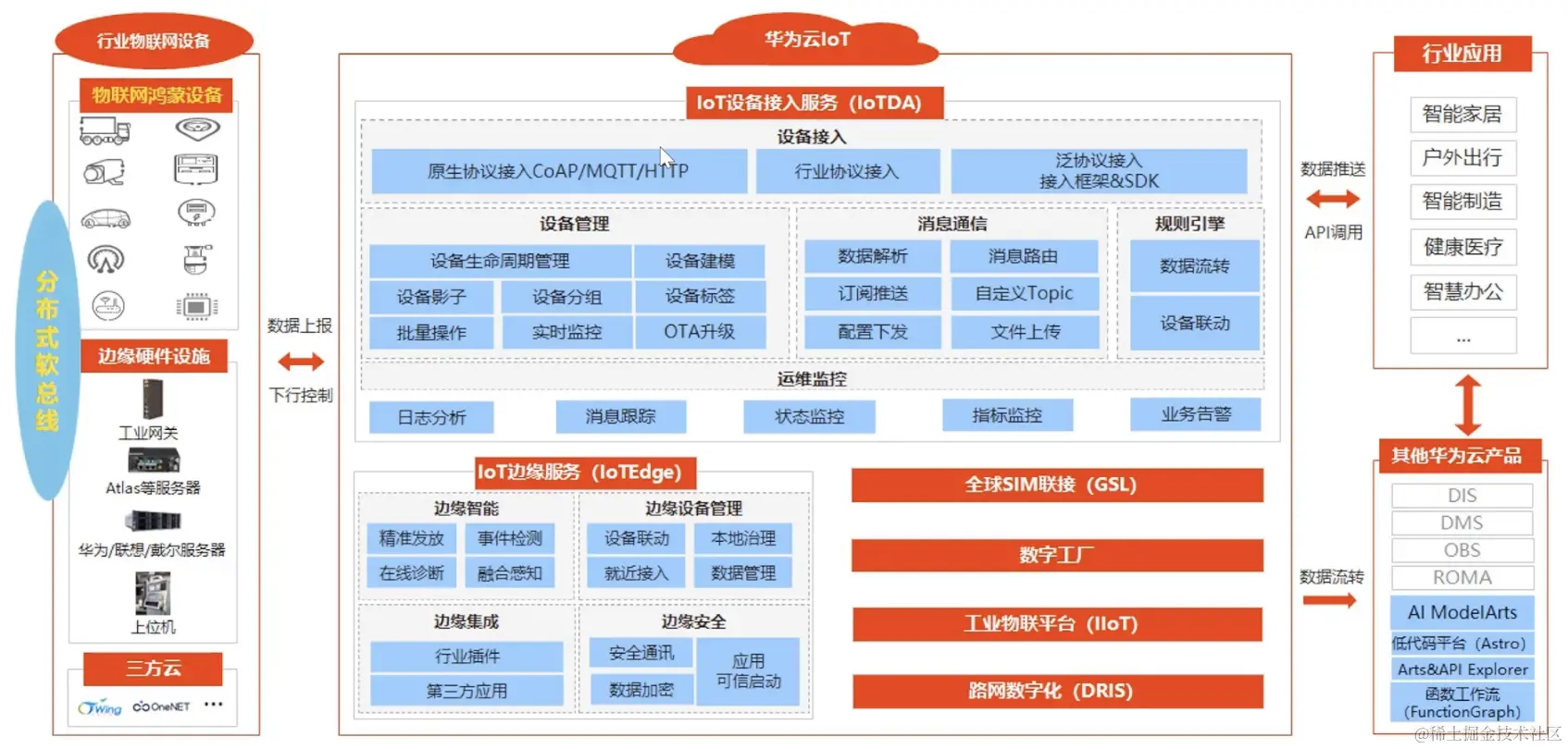 华为云loT的loTDA能力,即loT设备接入服务的能力。可以将物联网的鸿蒙设备、边缘硬件设施、三方云,对接到loT平台,实现数据上下的功能。