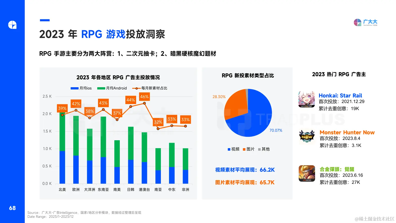 热门游戏品类上,RPG无疑是今年表现最为亮眼的一个赛道,各地区RPG月均广告主平均在1400名左右,每月RPG新素材量占比超35%,其中港澳台地区RPG素材创意迭代最快,月均新素材占比超46%。