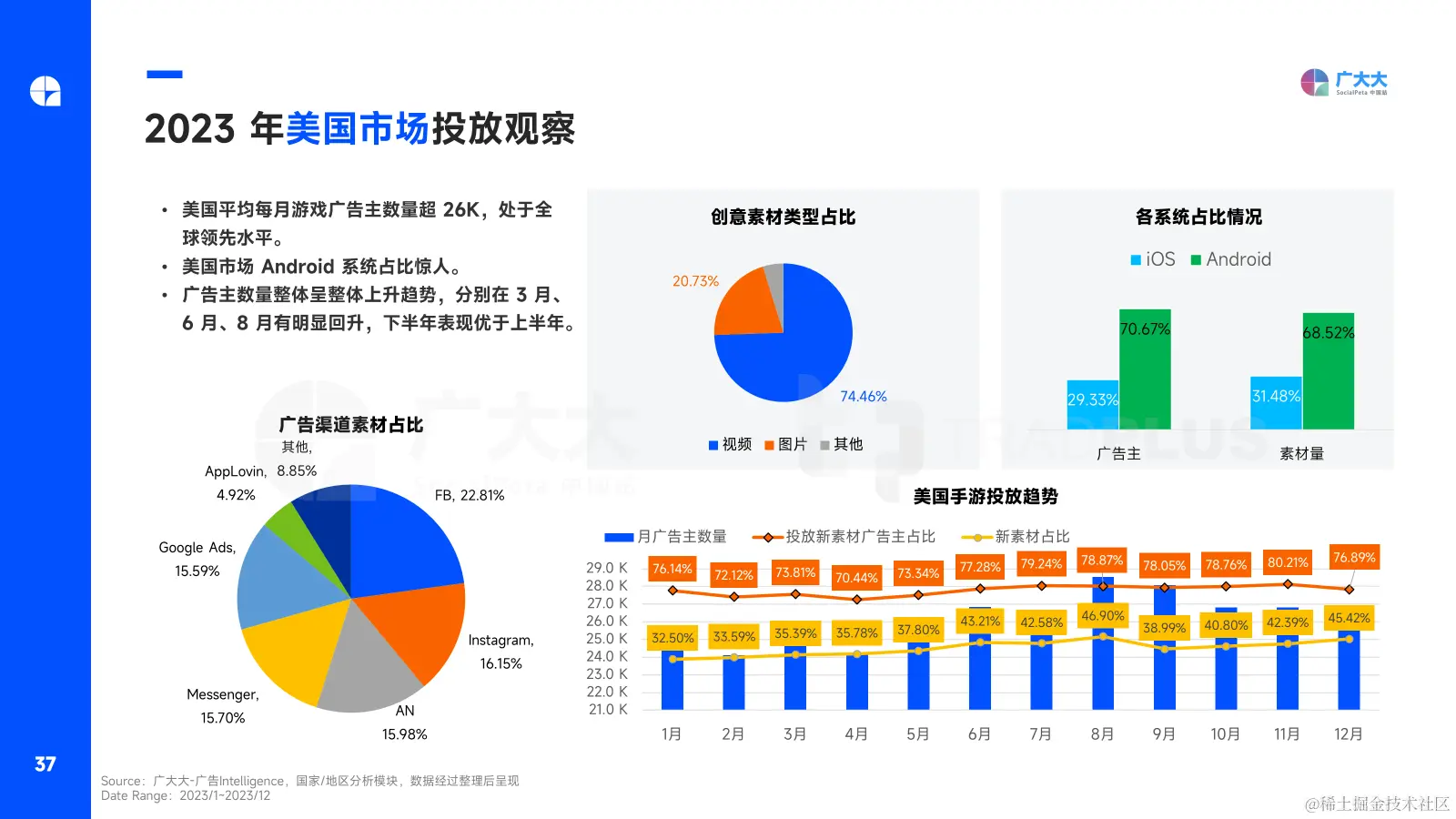 2023年美国平均每月手游广告主数量超2.6万名遥遥领先于其他国家/地区,其中Android端已经在美国手游营销中占据绝对主力地位,广告主占比超70%,素材量占比超68%。