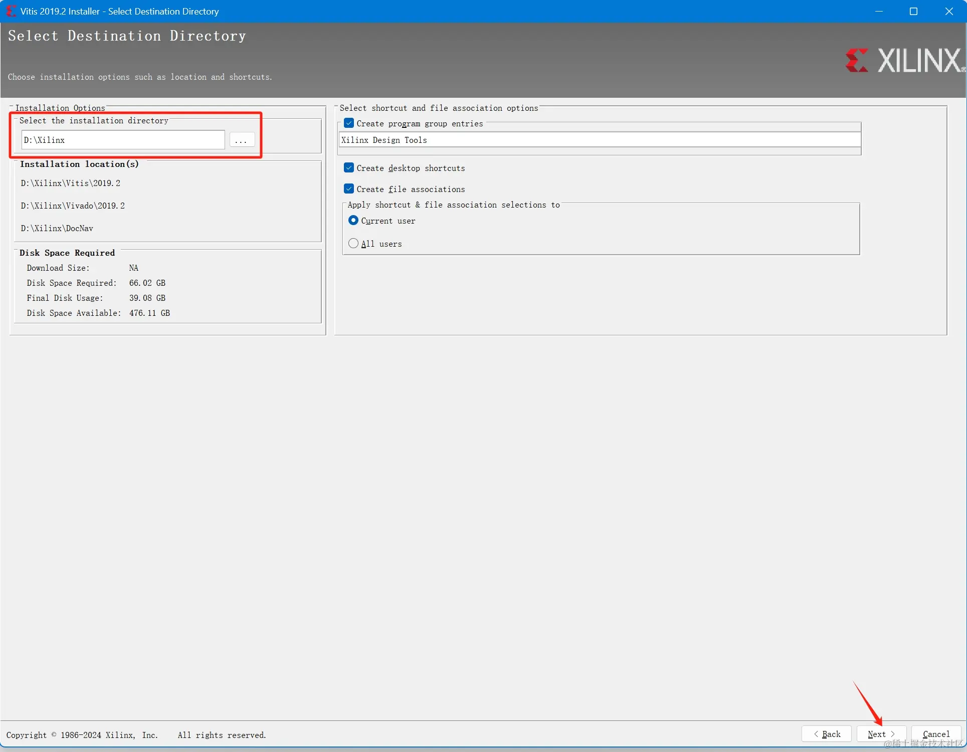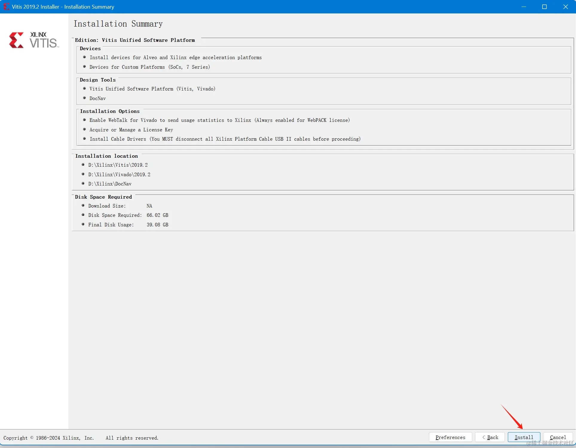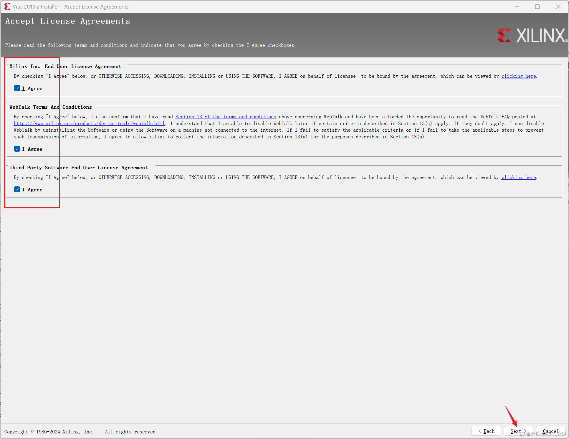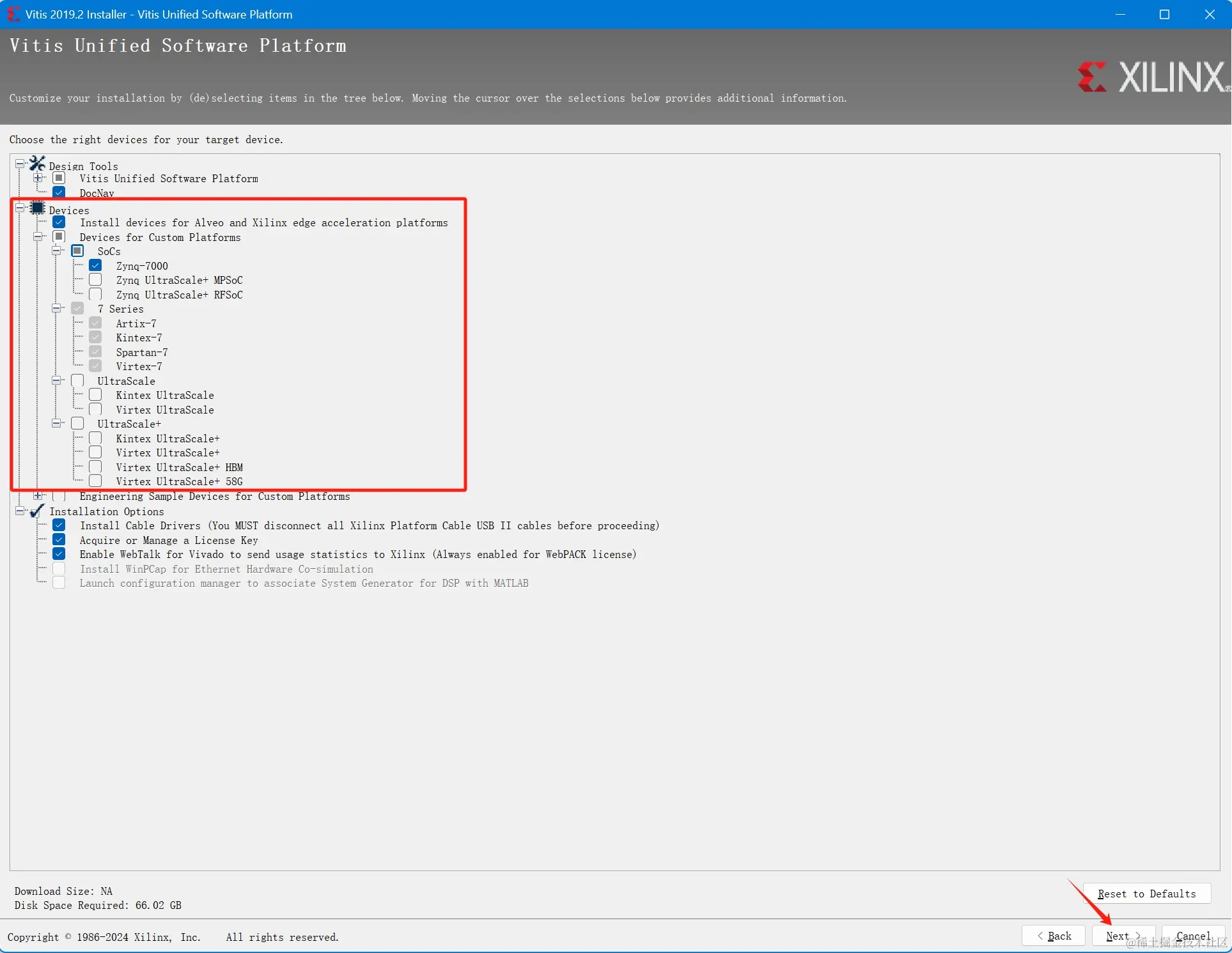 - 根据需求选择安装,可节省部分存储空间,笔者选择了 Zynq-7000 系列 SoC 和 A7、K7 FPGA,点击