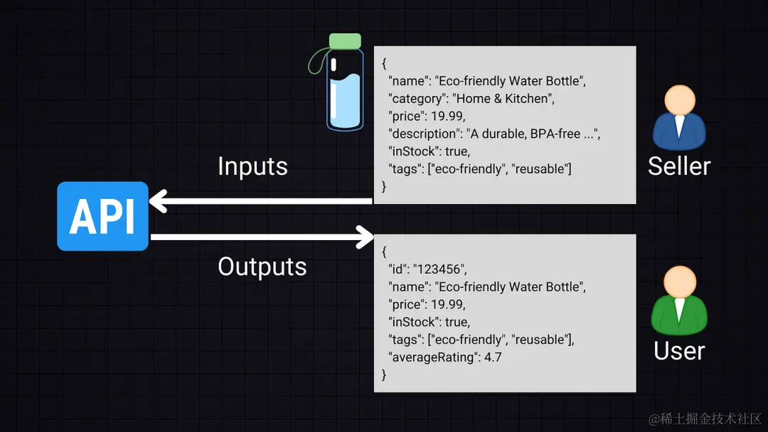 在API设计中,我们关注定义API的输入(比如新产品的产品详情)和输出(比如当某人查询产品时返回的信息)。