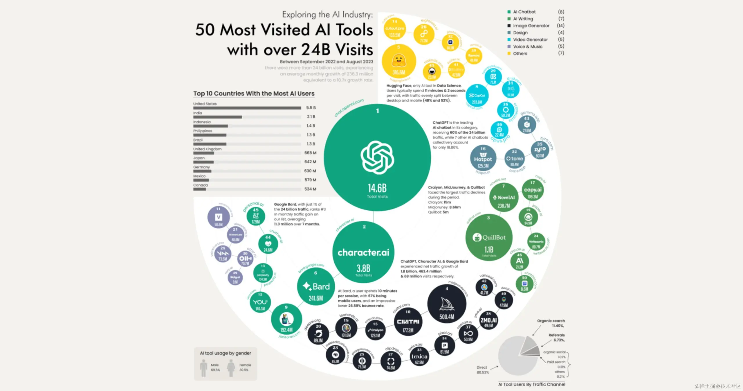 - 2022年9月至2023年8月,前50大AI工具吸引了超过240亿次访问。