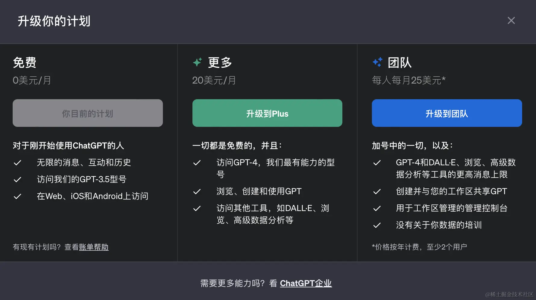 ChatGPT Team:2024年1月10日最新推出的针对团队用户和需要高级功能的用户,ChatGPT可能提供更定制化的服务,包括更高的GPT-4使用上限(经测试为100条/3小时),共享GPT等。具体详情请看下图。