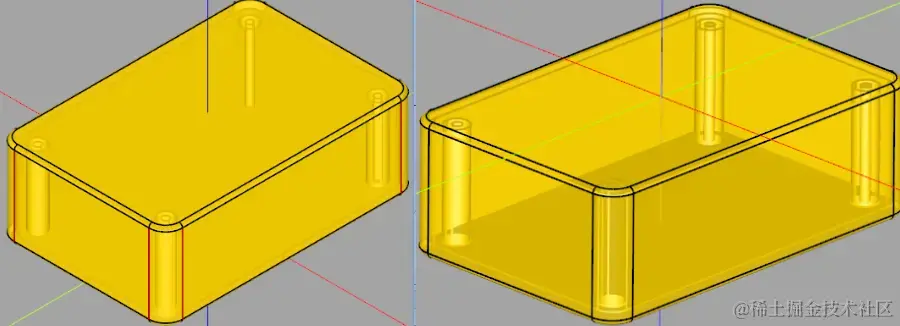 | |Z | 边平行于 z 方向,不管边的方向如何,只要和Z平行即可 对于上边两张图都可以使用 |Z 选中红色部分的边线 | cadquery.ParallelDirSelector |