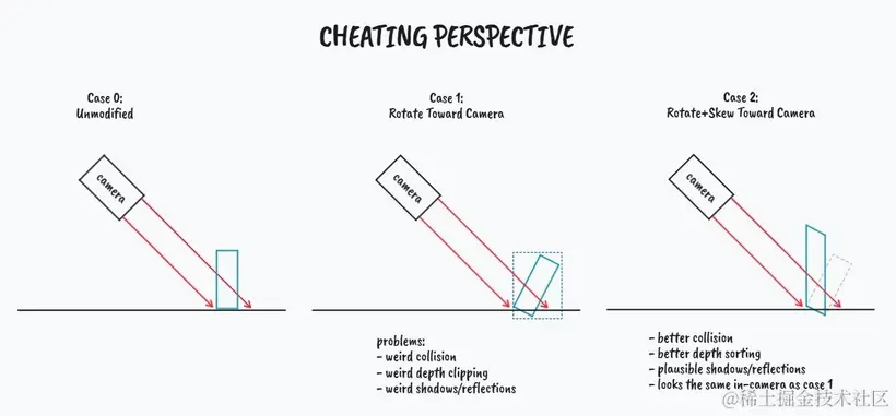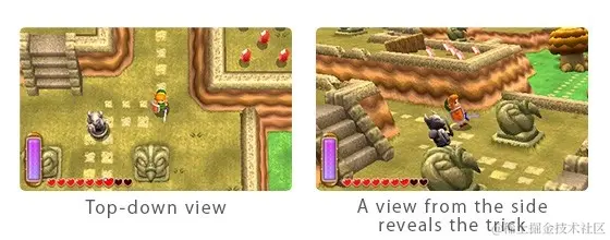 不同的游戏以不同的方式解决这些问题。著名的例子是,在《塞尔达传说:两个世界之间》,摄像机仰角是自上而下的90度,但有些对象和角色被设计成偏斜或旋转以面向摄像机。