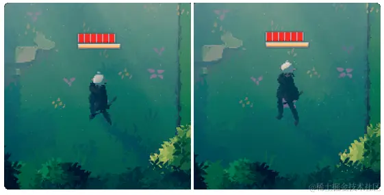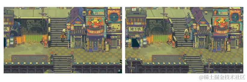 在具有类似但明显不同的设计方式的游戏《Eastward》中,这是一款表面上是2D的游戏,但实际上是在3D引擎中构建的,其摄像机仰角是正面的0度,但为了使地面可见,游戏世界在深度方向上进行了重度倾斜。这种设计允许游戏在保持正面视角的同时,通过倾斜游戏世界来展示地面和其他可能被直接视角遮挡的元素。这样的视觉处理增强了场景的三维感,同时仍保持了2D游戏的直观和可访问性。