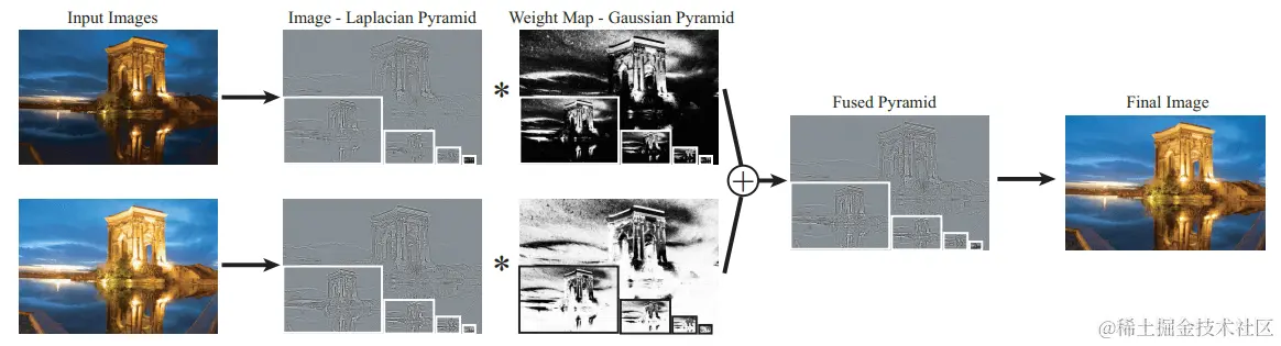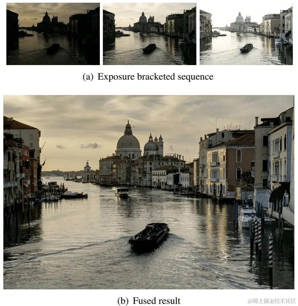 Exposure Funsion算法由Mertens et al[9]提出,是一种将多张图像(通常是不同曝光的图像)进行混合,但又保持细节、边界和最小化Halos的方法: