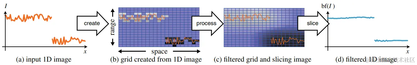 以一张1D的输入图片为例(图a),构建的Grid能在空间上将原图的Edge分开(图b),然后可以对Grid和Slice做一些模糊滤波(图c),最后从高维的Grid中取回结果(图d)。