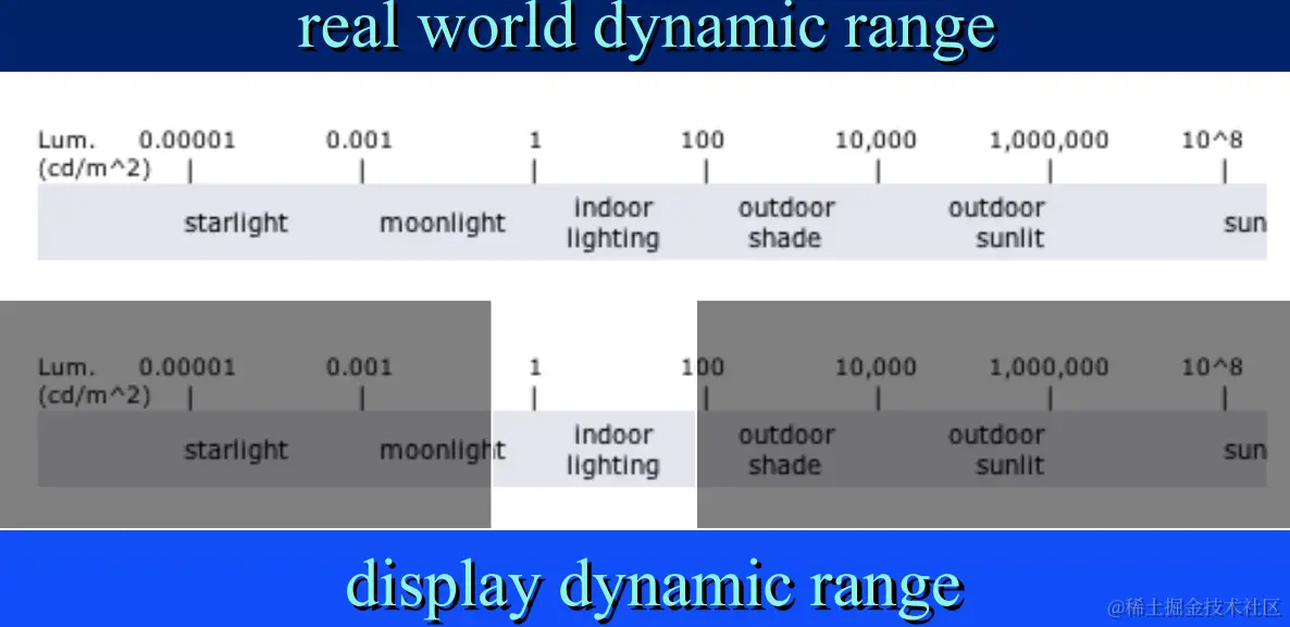 我们按照物理方式渲染最终得到了一个将要呈现的“原始图像”(Scene-referred),其信号的动态范围和物理世界的动态范围相近。但由于我们现在的显示器的可呈现的动态范围和物理世界相比实在太小: