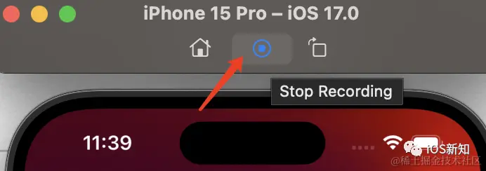 模拟器录屏快捷键 Command + R,停止可以点击顶部操作栏中的停止按钮: