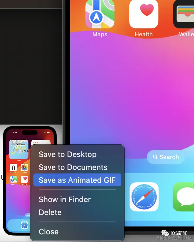 点击停止之后,会在模拟器的左下角出现一个预览页面,鼠标右键,在选择菜单中点击Save as Animated GIF 按钮即可。