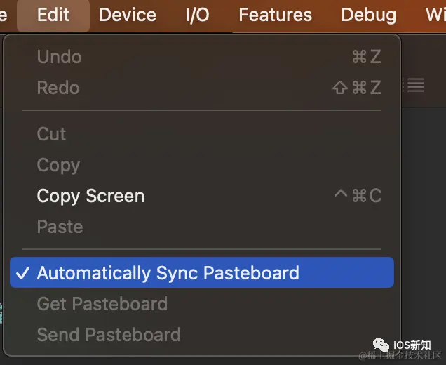 可以通过勾选模拟器顶部导航栏 Edit -> Automatically Sync Pasteboard 来实现电脑和模拟器之间的剪切板共享,打开之后,在电脑上复制的内容可以直接粘贴到模拟器上,反之亦然。