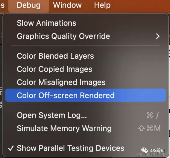离屏渲染是优化 FPS 常用手段,通过模拟器 Debug -> Color Off-screen Rendered,可以快速打开这个功能,然后模拟器上会把离屏渲染的部分显示出来。