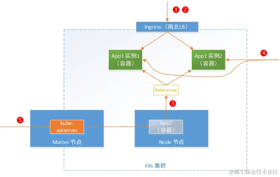 这里就不再分析,直接看如何通过Kube-apiserver来访问容器里面的App。下图(5)