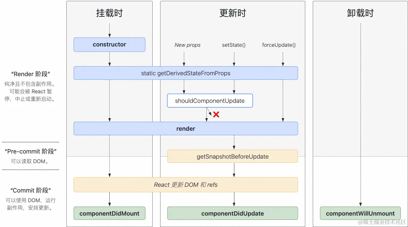 在react中有三个阶段,分别是初始化阶段、重渲染阶段和销毁阶段