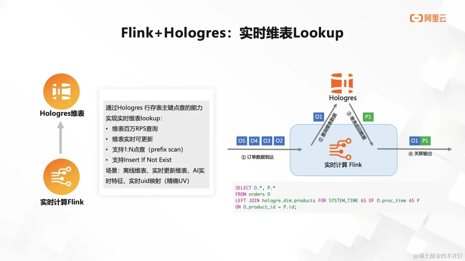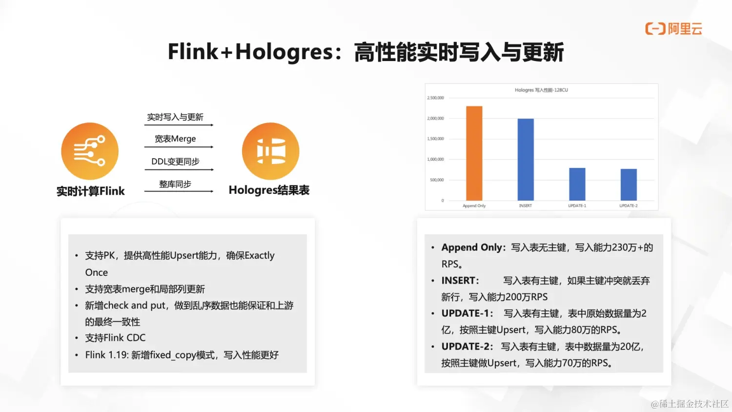 Flink 可以高性能实时写入 Hologres,数据写入即可查,右边是我们一年前的实测数据,可以看到在 128CU 的配置下,当写入表无主键,大概每秒钟能写 230 万条;当写入表有主键,主键冲突丢弃新行,每秒写入可达 200 万条;一般来说,表更新需要反查,那会随着数据量增大,更新性能会下降,Hologres 对已经拥有 20 亿条数据的表做更新,也能达到每秒钟 70 万条的更新性能。这种实时写入与更新的性能,非常合适结合 Flink 实现大量的更新和删除。