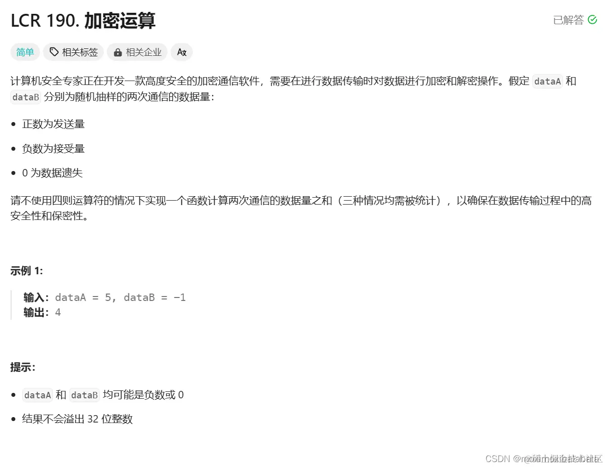 LCR 190. 加密运算https://leetcode.cn/problems/bu-yong-jia-jian-cheng-chu-zuo-jia-fa-lcof/