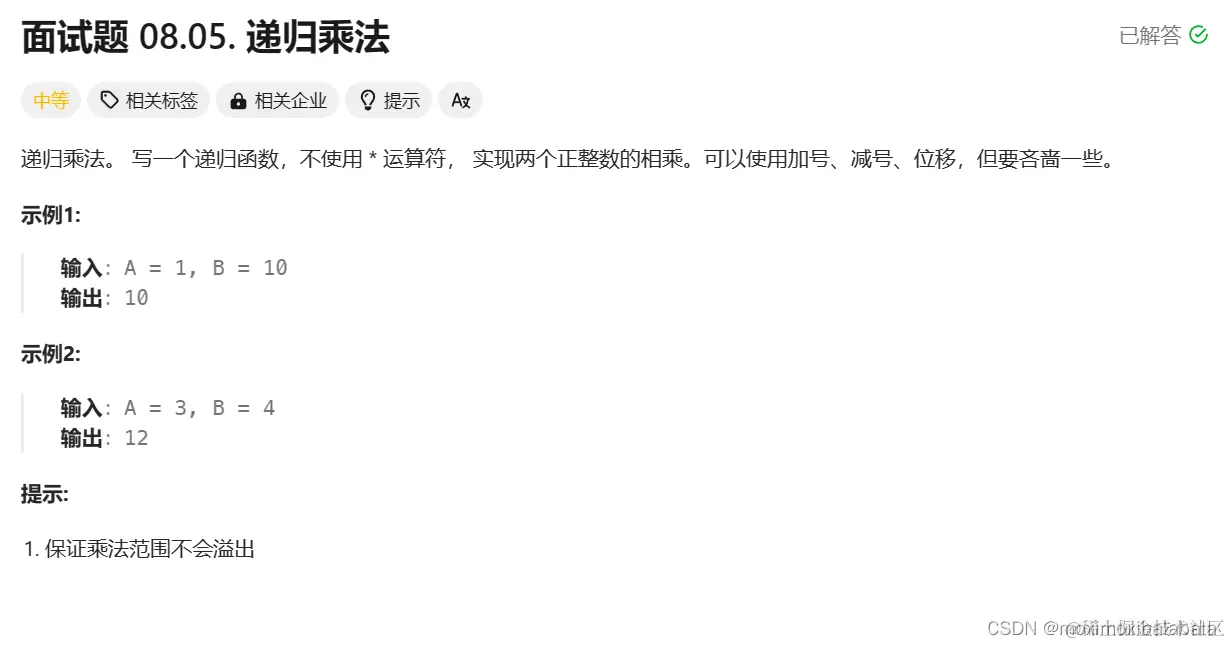 面试题 08.05. 递归乘法https://leetcode.cn/problems/recursive-mulitply-lcci/