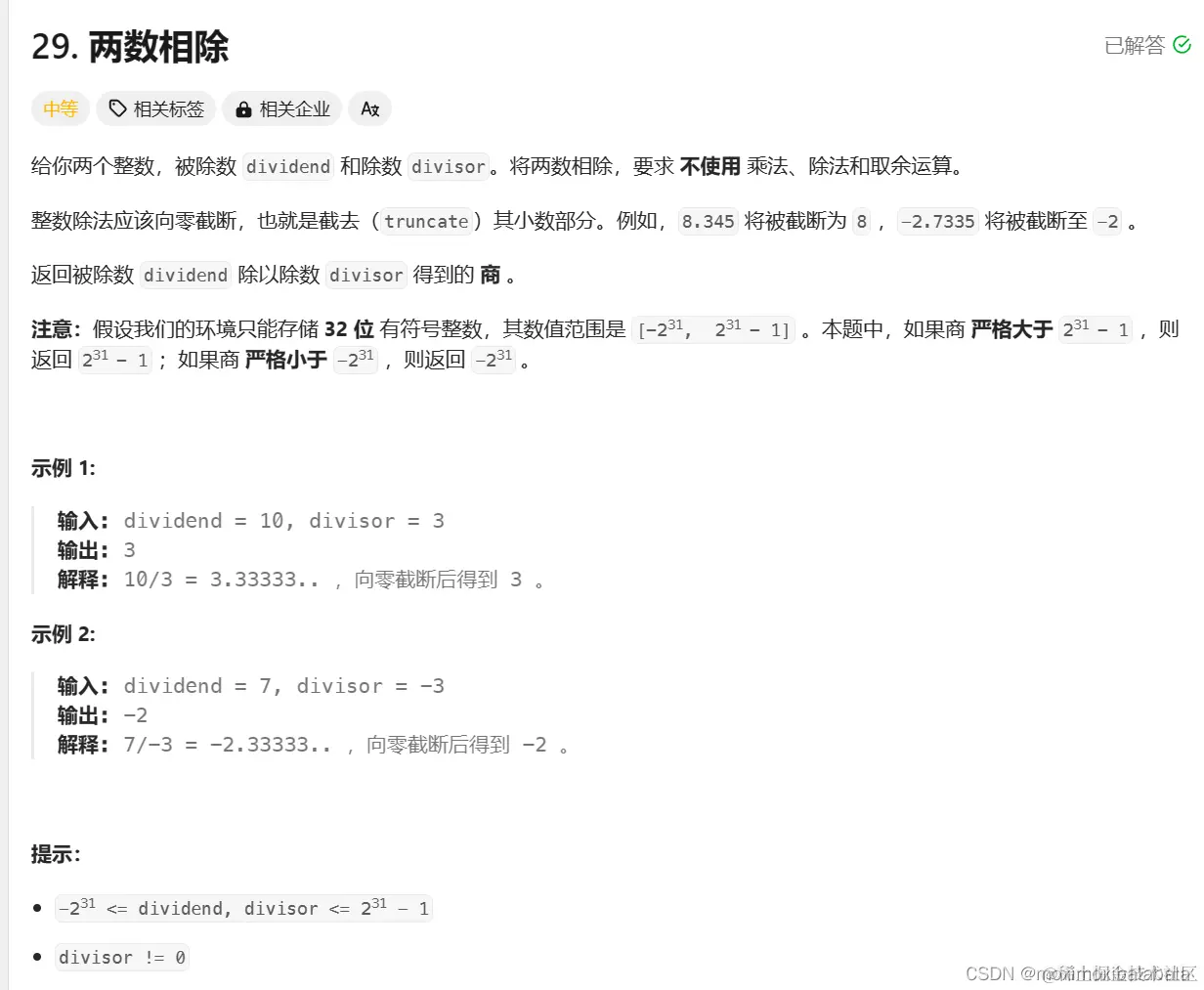 这题的话如果按照之前的思路的话那就是return dividend/divisor;但是我们写完之后还得考虑最后结果的范围。提示那边对数据范围是有解释的。题目说了环境只能储存32位有符号整数。dividend和divisor的范围都是**