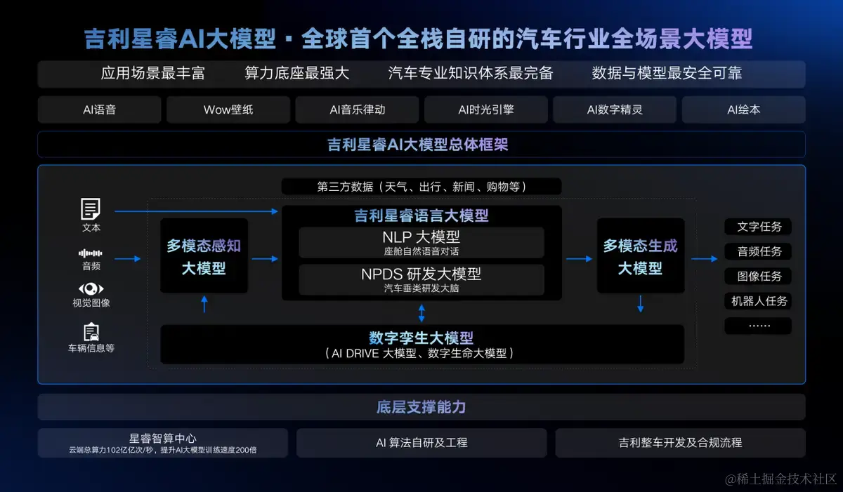吉利汽车发布全球首个汽车行业全栈自研 AI 大模型——吉利星睿 AI 大模型。基于星睿智算中心,将自研基础大模型与领先的 NPDS 研发体系深度融合,成为汽车行业最强大、应用场景最丰富的大模型。该模型拥有超千亿参数,丰富的知识库,实现多模态感知和生成,引领中国汽车全场景 AI 时代。