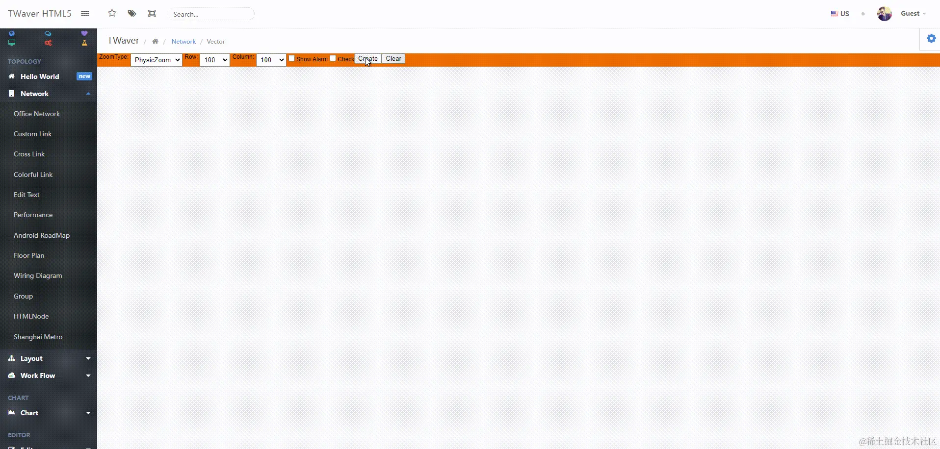但这跟长列表实现上有点不太一样,因为 twaver 内部是用 canvas 来绘制节点和链路的,并不是用 dom 绘制,所以虚拟列表那种思路在这里行不通