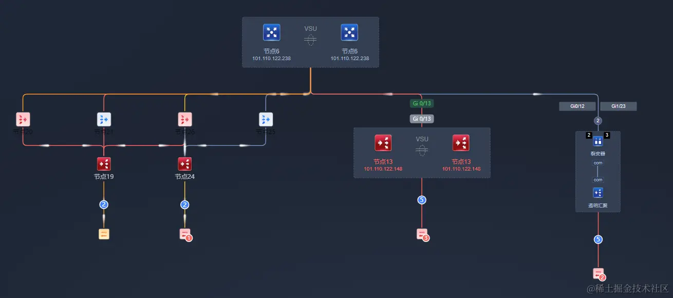 我基于 twaver.js 库实现了一个园区内网络设备的拓扑呈现,连线表示设备间的拓扑关系,线路上支持流动动画、告警动画、链路信息等呈现,如: