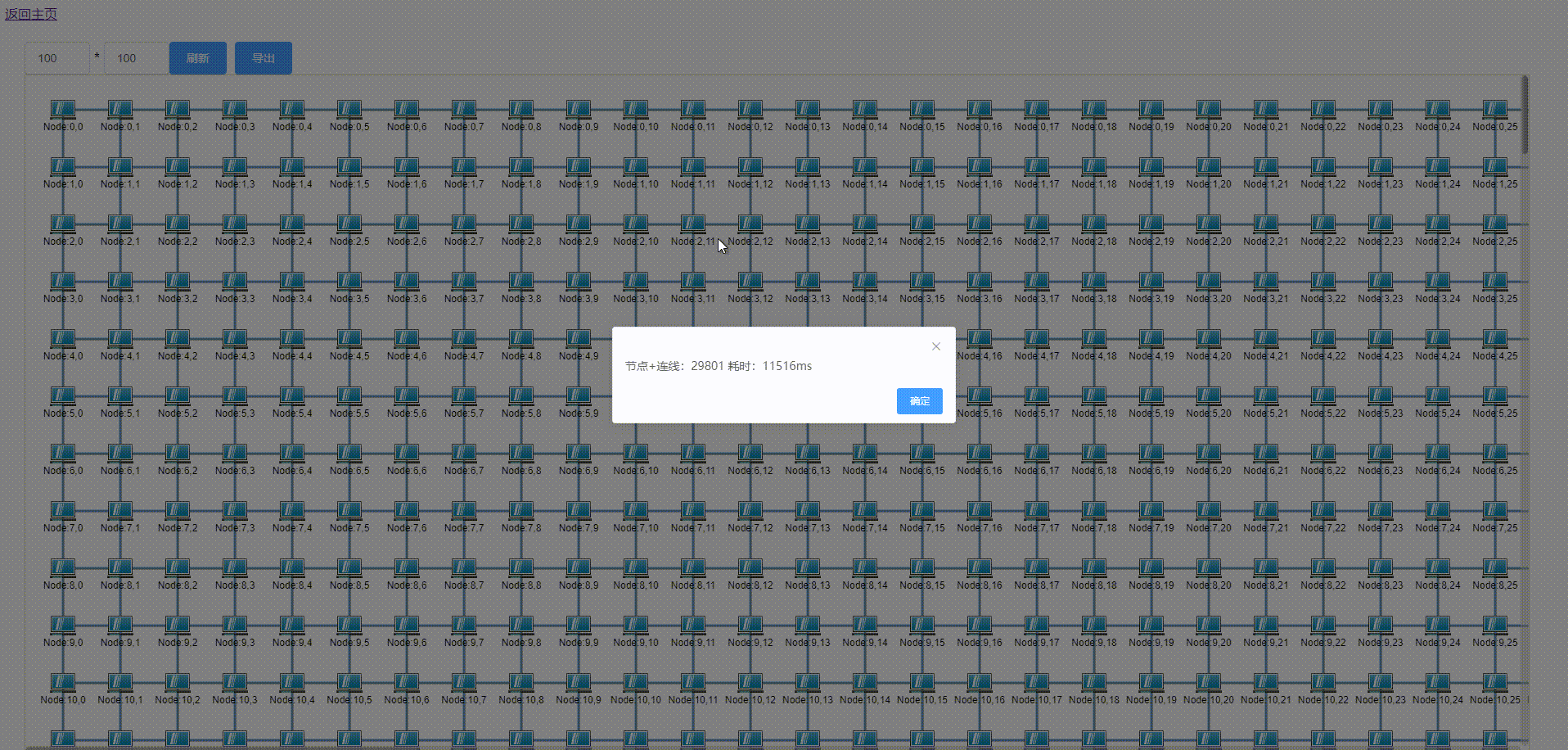 由于节点是直接借助 twaver 内部的 canvas 实现,因此节点数量太多导致的性能瓶颈问题是 twaver 库本身就存在的问题,虽然 twaver 已经做到 1W 级别的节点的丝滑呈现,但当数量继续加上去,达到 5W,10W 级别时,也会开始出现操作滞后感,卡顿等性能瓶颈