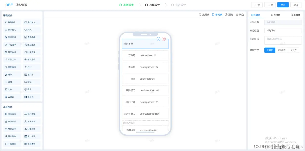 2.表单设计器: 在线可视化化表单设计器可快速建符合业务的表单,用于数据采集和流程审批,在线预览,所见即所得。