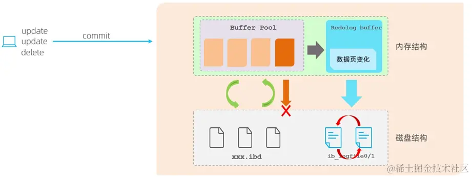 有了redolog之后,当对缓冲区的数据进行增删改之后,会首先将操作的数据页的变化,记录在redo log buffer中。在事务提交时,会将redo log buffer中的数据刷新到redo log磁盘文件中。过一段时间之后,如果刷新缓冲区的脏页到磁盘时,发生错误,此时就可以借助于redo log进行数据恢复,这样就保证了事务的持久性。而如果脏页成功刷新到磁盘或或者涉及到的数据已经落盘,此时redolog就没有作用了,就可以删除了,所以存在的两个redolog文件是循环写的。那为什么每一次提交事务,要刷新redo log 到磁盘中呢,而不是直接将buffer pool中的脏页刷新到磁盘呢 ? 因为在业务操作中,我们操作数据一般都是随机读写磁盘的,而不是顺序读写磁盘。而redo log在往磁盘文件中写入数据,由于是日志文件,所以都是顺序写的。顺序写的效率,要远大于随机写。这种先写日志的方式,称之为 WAL(Write-Ahead Logging 预写日志)。