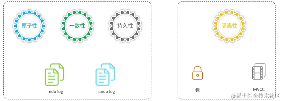 其中ACID四大特性,实际上分为两个部分,其中的原子性、一致性、持久性,实际上是由InnoDB中的两份日志来保证的,一份是redo log日志,一份是undo log日志。而隔离性是通过数据库的锁,加上MVCC来保证的。