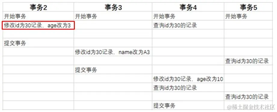 DB_TRX_ID : 代表最近修改事务ID,记录插入这条记录或最后一次修改该记录的事务ID,是自增的。 DB_ROLL_PTR :由于这条数据是才插入的,没有被更新过,所以该字段值为null。然后,有四个并发事务同时在访问这张表。