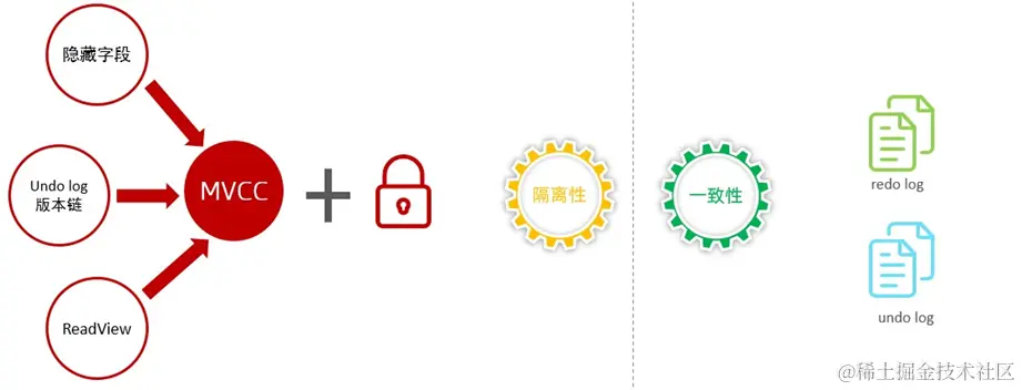 MVCC的实现原理就是通过 InnoDB表的隐藏字段、UndoLog 版本链、ReadView来实现的。而MVCC + 锁,则实现了事务的隔离性。而一致性则是由redolog 与 undolog保证。