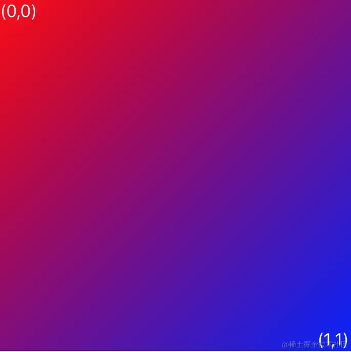 渐变的起始点和终止点是在图层的单位坐标空间中定义的,简单来说就是无论 CAGradientLayer 的尺寸是多少,为了在渐变中插值,我们认为左上角位置的坐标是 (0, 0),右下角位置的坐标是 (1, 1)。