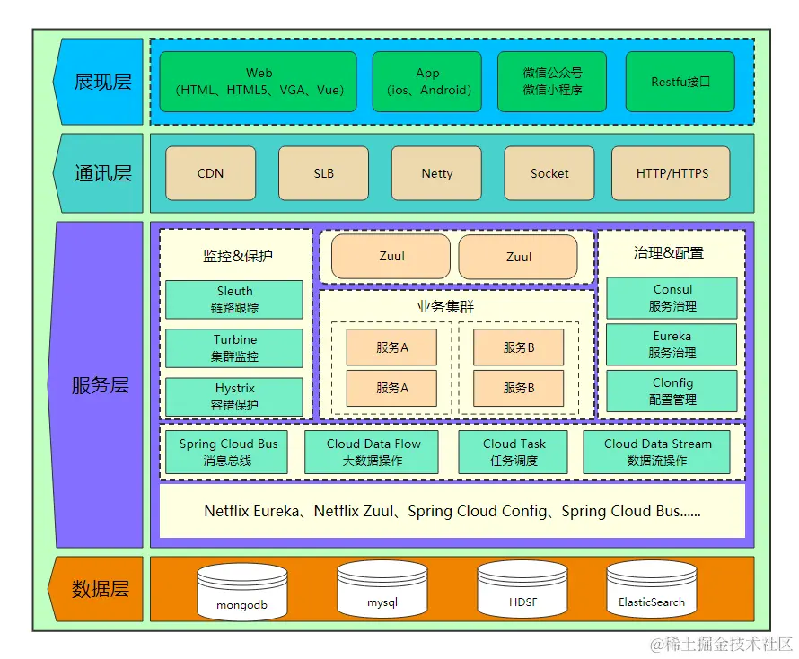 下图是springcloud微服务的逻辑视图(仅部分),描述了springcloud中各个功能组件。从这个图中,基本可以对springcloud有一个大颗粒度的了解。