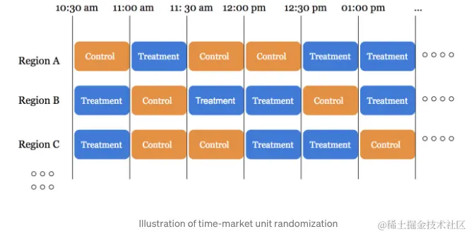 - 同一时间片下,不同空间区域单独随机,例如10:30-11:00下, Region A可能是对照组,而Region B会是实验组;